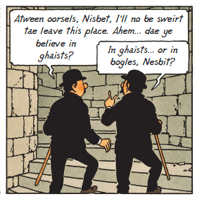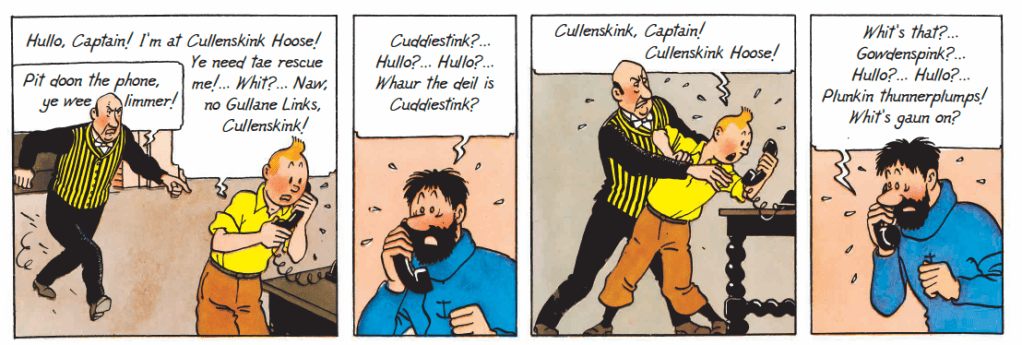 Cullenskink Hoose (Snaws o Tibet etc) the ancestral home of Captain Haddie. Cullen skink is a traditional Scottish soup made with smoked haddock (haddie), tatties and milk. (In the original French, it is Château de Moulinsart.)