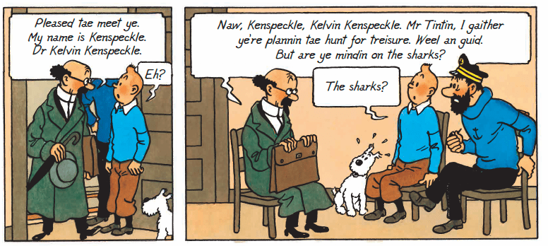 Kelvin Kenspeckle (Rachlan the Reid) the hard-of-hearing inventor of the shark submarine. His first name is a homage to Glasgow University physicist William Thomson (Lord Kelvin) and his surname means ‘conspicuous or easily recognisable’. (In the original French text, his name is Tryphon Tournesol.)