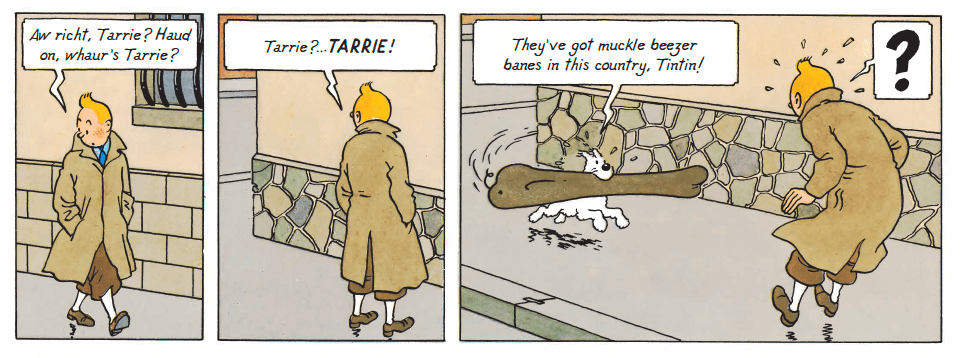 Tarrie Tintin’s faithful companion. His name means terrier in Scots. He is called Milou in French, Snowy in English, Terry in Danish and Norwegian, and Tobbi in Icelandic! For names in other languages, see this list.