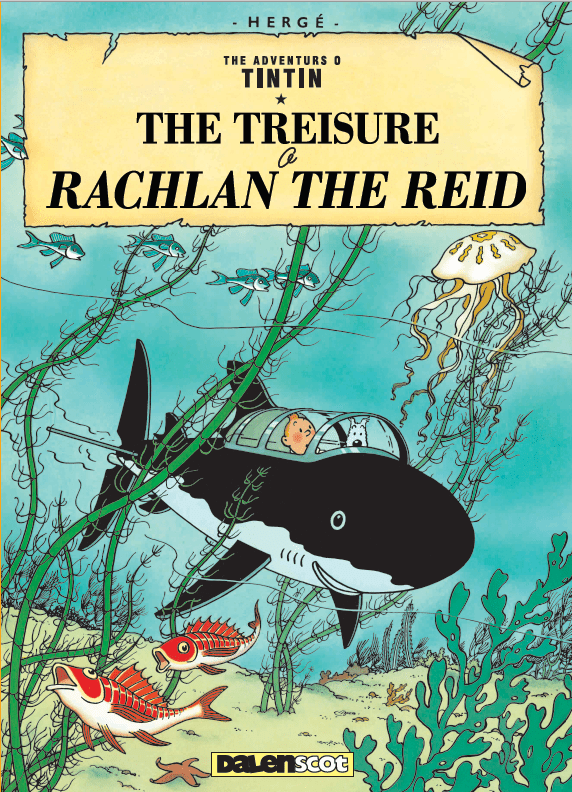 In The Treisure o Rachlan the Reid, Tintin an his freens mak for the Caribbean in search o the lang-tint pirate treisure. Their quest leads them tae a desert island inhabitit by papingoes that skirl an flyte in Scots. Syne, aneth the waves, they find the wrack o the Unicorn, and an auld sea-kist fu o drookit documents — documents that reveal bumbazin news!